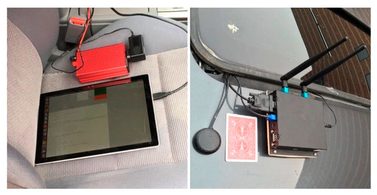 We developed the software by using Autotalks SDK (Software Development Kit) for device configuration and data generation running on the DSRC OBUs. The data include the current longitude, latitude, altitude, heading angle and ground speed from the GPS sensor, as well as the timestamps, packet counters, and RSSI of each packet. The timestamps are inserted before each packet has been sent and after it has been received on both OBUs. Packet counters were used for PD rate calculation. On the micro-controllers, we developed a GUI (graphical user interface) based on Linux OS to collect data from the OBUs as well as to send the configuration parameters to control them. The collected data can be stored locally or sent to our private server for real-time display. The custom parameters include data rate, packet rate, packet size, transmit power, channel number, priority, etc. A DSRC OBU, GPS antenna, and an additional micro-controller for the DSRC network vehicle experiments, are shown in Figure 2.