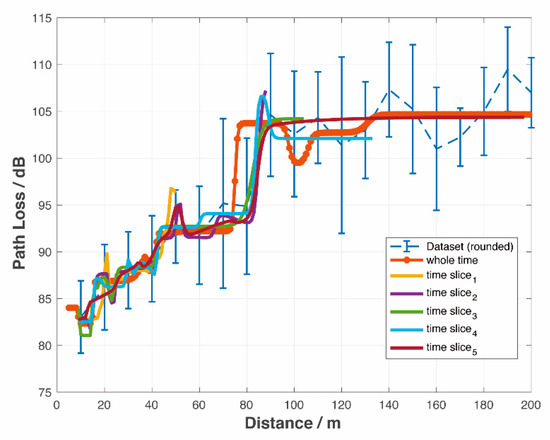 As for PL models, various methods are applied in PL models, such as theoretical models based on Maxwell’s equations, ray tracing models based on simulation, and empirical models, parameters of which are derived from experimental data for each defined category. Empirical models characterize the channels in corresponding scenarios well. The typical free space channel model and Stanford University Interim (SUI) models were applied to urban environments in centimeter-wave and millimeter-wave frequency bands [22]. Improved Rural Macrocell (RMa) models were applied to rural areas in the frequency range from 0.5 GHz to 30 GHz [23]. A bounded model is used to calculate the decay of signal power caused by PL [24]. Artificial neural network (ANN) models were used for macrocell PL prediction [25], and a 3rd Generation Partnership Project (3GPP) blockage model was utilized to predict the PL caused by the blockage of traffic sign posts [26]. When the environment changes, these kinds of empirical models are no longer valid. An Alpha-Beta-Gamma (ABG) model and a Close-In (CI) free-space reference distance model was introduced to predict PL through a measured dataset [27]; these are also empirical models but can adapt to changes in the environment. In addition, there are many NN-based PL methods in wireless communications [28,29,30,31]. They are very valuable and useful in static PL prediction. However, in real-time PL prediction, we need to predict the real-time PL in a short time. That is, these methods face the drawback of sacrificing local information or over-fitting when predicting real-time PL in wireless communication. In contrast, the proposed NN-based PL model can overcome these deficiencies and show more accurate results in real-time PL prediction.