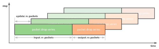 Packet drop series could be regarded as time series, which could be predicted by both the NN-based method and statistical average method. The proposed model takes packets to predict PDR in following packets. The model updates itself in every packets. Usually, ; thus, the prediction window is able to cover transmission times of interest. The framework of the PDR prediction is shown in Figure 7.