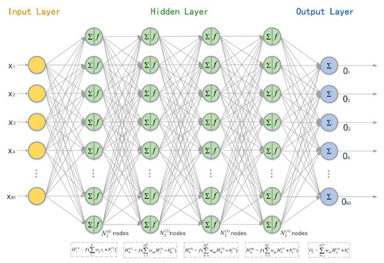The weight of the path from the input layer to the hidden layer is denoted as and the weight from the hidden layer to the output layer is . The number of nodes in the input layer, hidden layer, and output layer were , , and , respectively. Thus, we have , , and . The weight vectors of each perceptron were optimized using the back-propagation algorithm. We used the accumulated error BP algorithm and adjusted and to minimize the global error . NN computations, starting from input data and going on to the hidden/output layer weights computations, are shown in Table 2.