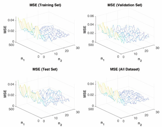 The simulation results are shown in Figure 9. It shows the values of MSE during the training, validation, test, and overall set. MSE roughly reduces with the decrease of or the increase of . The set of = 180, = 20, and = 10 achieve the maximum value of .