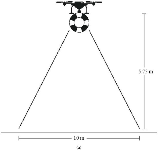 For the autonomous rescue UAV to reach the incident area, the UAV’s controller checks if the absolute distance between the swimmer and the UAV is less than the pre-specified limits (dlat, dlong) defined by the entire system’s administrator during its setup. Details about these limits are analytically described in [9,10]. At this point, the potential victim is located within the Field of View (FoV) of the onboard camera, while the UAV flies above a minimum altitude. Provided that our camera’s FoV is 82o, the minimum Altitude in order to cover the complete circle of radius R = 5 m is about Alt = 5.75 m (see Figure 8a). Since the UAV is flying at Alt = 10 m, the human in peril will certainly be located inside the cameras’ FoV. Then, image processing will be activated and the human detection algorithm will be activated on the on-board autonomous computing machine. A successful human detection process will return the distressed swimmer’s coordinates in the image frame and the control algorithm’s calculation for the UAV’s speed in x, y axes will be activated. Next, the main objective of the UAV motion controller is the aerial vehicle’s movement in the proper direction in order to be exactly over the swimmer and to start descending at a pre-specified altitude above him/her. The validation of the UAV’s precise positioning is a crucial factor in such rescue systems as the rescue apparatus should be released as close as possible to the distressed human, at a maximum distance of ±0.5 m.