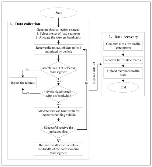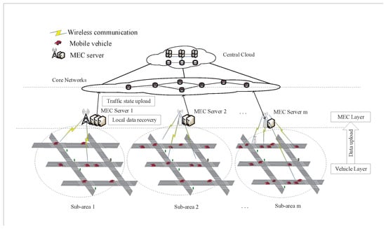 Recently, mobile edge computing (MEC) [,] has become one of the most promising paradigms by offloading resources at the network edge, especially in vehicular networks. In particular, each MEC server installed along the roadside, owns computation and communication capabilities, which can undertake local service computing for vehicles via wireless communication without the help of remote cloud. For traffic sensing, the MEC service architecture provide the chance of flexible data collection strategy and efficient data recovery at local server, which alleviates much pressure on the central cloud and backbone networks. Specifically, the MEC server can control the data selection strategy, which provides possibility of flexible data selection among mobile vehicles within limited bandwidth constraint. Furthermore, the data recovery is implemented at the MEC server, which brings computation offloading at network edge and reduces extra transmission cost between terminal users and cloud servers.