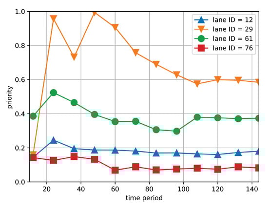 Based on Equation (11), this paper evaluates the correlation magnitude of each road segment at each time period . For each element in , we replace by 0 and compute estimation of as . Then, we define the priority of the element as follows.