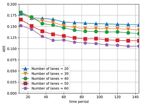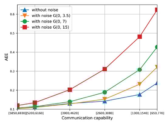 Figure 14 compares the AEE of the proposed algorithm under different magnitudes of additive noise. Specifically, we add the white Gaussian noise to the original data set and perform traffic state estimation based on the contaminated data. The white Gaussian noise is represented by , where u and is the mean and standard deviation. As the average speed of vehicles is 35 km/h in statistics, , and represents , and noise added to the original data, respectively. As shown in Figure 14, when the communication capacity is high, white Gaussian noise does not affect the AEE too much even with noise. When the communication capacity reduces, white Gaussian noise can increase the AEE greatly and results in low accuracy of traffic estimation. Therefore, it is necessary to add some denoising approach [] to filter the noise from the collected data set, which is caused by uncorrelated factors, such as the parking vehicle along the roadside and other outlier measurements. However, it is observed that when the magnitude of noise is less than 20%, the proposed algorithm can still work well when the communication capacity is high. Therefore, this set of simulation results shows the reliability of the proposed algorithms against noisy data on the condition of high communication capacity.