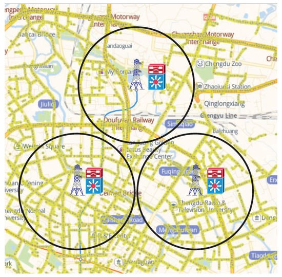 The data set of the first day is used for evaluating the priority of road segments and the data of the second day is used for traffic data collection and evaluation. In statistics, the total number of taxis is 30,000. The sampling rate is [0.25,0.5] per second, which indicates that the vehicle periodically requests for data upload in every 2∼4 s. The simulation area is the core district within the second ring road of Chengdu City, as shown in Figure 5. The mapping method from the traffic data to the road segment in the real-world map is based on the literature []. The whole area is divided into three sub-areas and each sub-area is monitored by a MEC server, which manages around 60∼80 road segments. Furthermore, the communication capacity of each MEC server is defined as the maximum number of traffic data item uploaded by vehicles per time unit, whose default value is set to [2600,3080] data items per minute.