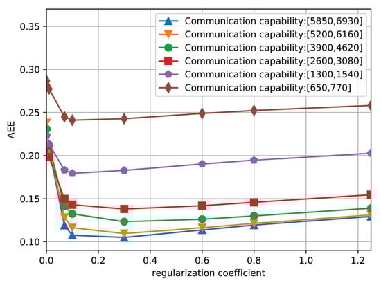 First, we conduct the performance evaluation of the proposed algorithm under different regularization coefficients, which changes from 0.001 to 1.25. In particular, Figure 6 shows the AEE curves of the proposed algorithm under six different communication capacities. It is observed that the shape of the six curves are similar and the AEE of the six curves decrease at first and then increases slowly, which indicates that there exists a point with the minimum value of AEE. Therefore, we set the value of to 0.07.