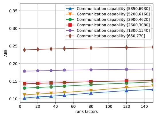 Second, we conduct the performance evaluation of the proposed algorithm under different rank factors, which changes from 1 to 150. In particular, Figure 7 shows the AEE curves of the proposed algorithm under six different communication capacities. It is observed that six curves maintain a straight line, which indicates that the proposed algorithm is not sensitive to the rank factors. Therefore, in the simulation, we set the value of rank factor to 100.