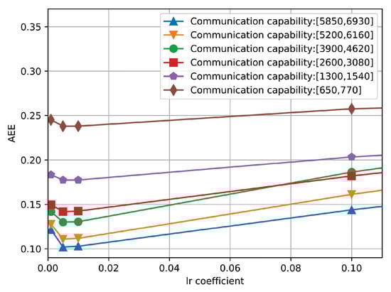 Thirdly, we conduct the performance evaluation of the proposed algorithm under different learning rates, which changes from 0.001 to 0.1. In particular, Figure 8 shows the AEE curves of the proposed algorithm under six different communication capacities. It is observed that the AEE of the proposed algorithms first decreases and then increases slowly. In particular, the minimum value of is achieved when achieves 0.005. Therefore, in the simulation, we set the value of to 0.005.