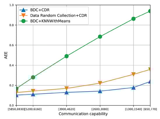 Figure 9 shows the AEE of the three algorithms under different communication capacities. With decreasing communication capacity, the AEE of the three algorithms increases. It is because lower communication capacity brings lower amount of collected data, which provides less useful information for traffic recovery. Furthermore, the AEE of BDC + CDR is lower than that of RDC + CDR in all cases, which validates the effectiveness of BDC. Then, the BDC + CDR also achieves lower AEE than BDC + KNN with Mean, which indicates that the CDR can achieve higher estimation accuracy under the same data collection strategy.
