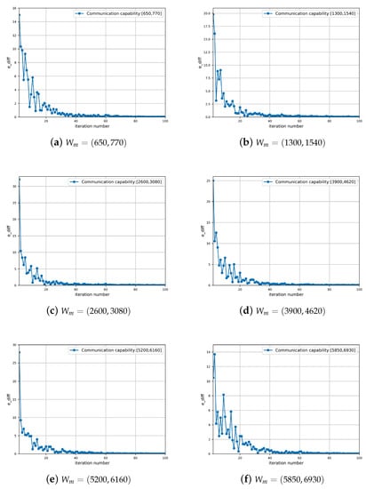 Furthermore, to validate the convergence efficiency of the CDR, Figure 10 compares the under different communication capacities. In particular, is defined as the difference of e (shown in line 14 in Algorithm 2) between two adjacent iterations. It is observed that the converges to the zeros point efficiently across all the cases. In particular, the stop criterion is satisfied before the iteration number achieves 60, which indicates that the maximum iteration number can be considered to be a small constant. Therefore, this set of simulation results validates the efficiency and superiority of the proposed algorithm against heterogeneous communication capacities.