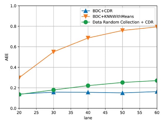 Figure 11 shows the AEE of the three algorithms under different numbers of covered road segments. Specifically, the number of covered road segments is determined by the service range of MEC server. In this set of simulation, the communication capacity of each MEC server is fixed to 1600 uploaded traffic data items per minute. It is observed that the AEE of three algorithms increases gradually with the increasing number of covered road segments. It is because the required amount of traffic data has exceeded the communication capacity of the MEC server. However, the BDC + CDR achieves much lower AEE than BDC + KNN with Mean, which indicates that the BDC + CDR still can find out better correlation between the missing data and collected traffic data. Additionally, the performance gap between BDC + CDR and DRC + CDR becomes larger with increasing number of covered road segments, which indicates that the proposed data collection strategy can play a critical role when the communication capacity becomes the bottleneck.