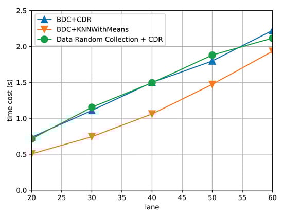 Furthermore, to test the algorithm efficiency, Figure 12 compares the time cost of the three algorithms under different numbers of covered road segments. It is observed that the time cost of three algorithms increases with increasing the number of covered road segments. In particular, the time cost of proposed algorithm is almost the same to Random select + CDR, which verifies the efficiency of the BDC algorithm. Furthermore, the BDC + KNN achieves the least time cost. It is because the KNN estimates the missing traffic state by only averaging the traffic state of road segments with small cosine similarity but the CDR is based on measured traffic state matrix. However, the gap between the BDC + KNN and the proposed algorithm is small, and the proposed algorithm achieves much lower AEE than BDC + KNN. Additionally, the time cost of the proposed algorithm is linear to the number of covered road segments, which validates the time complexity analysis of Algorithm 2 in Section 5. Therefore, this set of simulation results show the adaptiveness of the proposed algorithm against different scales of traffic sensing areas.