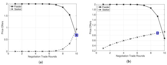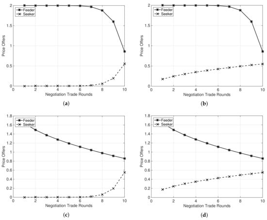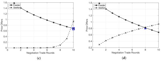 Figure 2a–d shows a case of no agreement in a negotiation trade. Here, we considered that the number of feeder MSs, , is comparatively higher than the previous plots in Figure 1, i.e., . In this case, although the feeder and the seeker MNOs enter a negotiation trade, no agreement can be reached upon any of the proposal offers. Notably, it does not satisfies the necessary condition for the negotiation to be successful in Equation (8), i.e., for the negotiation to be successful, the seeker’s reservation price needs to be higher than the feeder’s reservation price and the agreement price is in between, .