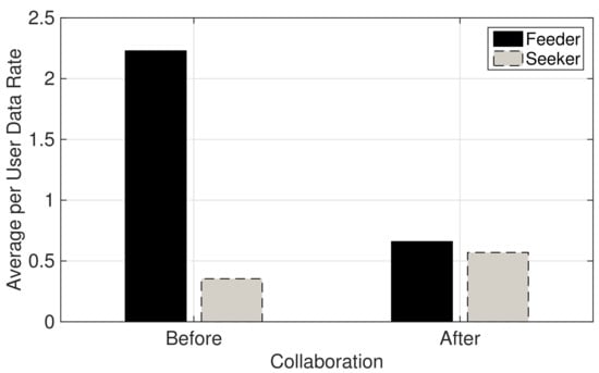 Before and after collaboration average per-user data rate of the feeder and the seeker MNOs.