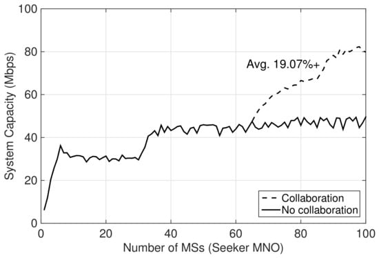Figure 5 shows the system capacity of the seeker MNO that is obtained after collaboration and compared with the case of no collaboration. In the figure, the collaboration improves the system capacity of the seeker MNO by enabling some of its MSs to be served by utilizing the feeder MNO’s network resources. However, the number of MSs being served by the feeder could be limited depending on the number of MSs belonging to the feeder MNO, . In this regard, the system capacity of the seeker MNO would be dependent on since it dictates how many extra MSs the feeder would be able to serve using its network resources while maintaining the average data rate per-user. From simulation, the average number of MSs that the feeder could serve while maintaining the average data rate per-user is 56. Hence, for given , the feeder could collaborate to serve extra MSs belonging to the seeker MNO, i.e., at most . The seeker MNO requires at most of its users to be served by the feeder MNO to maintain its average data rate per-user. Since , the feeder MNO can serve all additional 35 MSs belonging to the seeker MNO. In Figure 5, the system capacity of seeker MNO after collaboration is improved as compared to no collaboration on average by .