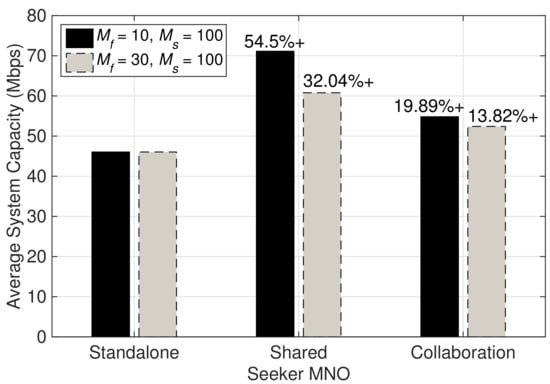 Average system capacities comparison of the seeker MNO before and after collaboration. (a) and ; (b) and .
