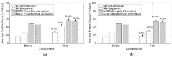 In Figure 9a,b, all the schemes improve average system capacity of the seeker MNO with collaboration as compared to no collaboration. Moreover, as the number of increases (compare Figure 9a,b), the corresponding average system capacity improvement after collaboration is decreased for all schemes. This result is consistent with the observation in Figure 7 and due to the fact that the feeder MNO could serve fewer MSs belonging to the seeker. Figure 9a,b also signifies the importance of resource allocation schemes. As compared to the BR strategy schemes, both MCBR schemes provide significant improvement in average system capacity for both before and after collaboration. Thus, the increment of from 10 to 30 does not have significant effect on the average system capacity of a seeker MNO while using MCBR schemes.