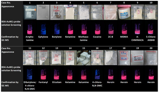 Yen, Y.-T.; Chen, T.-Y.; Chen, C.-Y.; Chang, C.-L.; Chyueh, S.-C.; Chang, H.-T. A Photoluminescent Colorimetric Probe of Bovine Serum Albumin-Stabilized Gold Nanoclusters for New Psychoactive Substances: Cathinone Drugs in Seized Street Samples. Sensors 2019, 19, 3554. https://doi.org/10.3390/s19163554