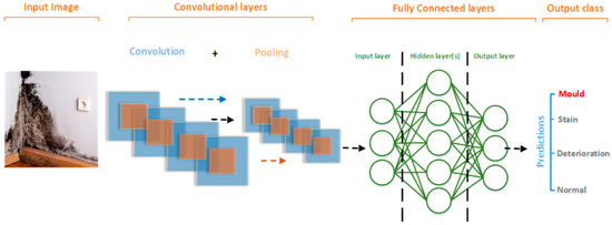 The aim of this research is to develop a model that classifies defects arising from dampness as “mould”, “stain” or “deterioration”, should they appear in a given image, or as “normal” otherwise. In this work we also examine the extent of ConvNets role in addressing challenges arising from the nature of the defects under investigation and the surrounding environment. For example, according to one study, mould in houses can be black, brown, green, olive-green, gray, blue, white, yellow or even pink [66]. Moreover, stains and paint deterioration do not have a defined shape, size or colour and their physical characteristics are heavily influenced by the surrounding environment, i.e., the location (walls, ceilings, corners, etc.), the background (paint colour, wallpaper patterns, fabric, etc.) and by the intensity of light under which images of these defects were taken. The irregular nature of the defects imposes a big challenge when obtaining an adequate large-enough dataset to train a model to classify all these cases.