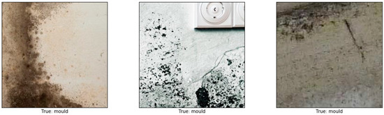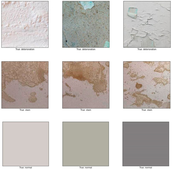 Images of different resolutions and sizes were obtained from many resources, including photos taken by mobile phone, a hand-held camera, and copyright-free images obtained from the internet. These images were sliced into 224 × 224 thumbnails to increase the size of our dataset producing a total number of 2622 images in our dataset. The data was labelled into four main categories: normal (image containing no defects), mould, stain, and paint deterioration (which includes peeling, blistering, flacking, and crazing). The total number of images used as training data was 1890: mould (534 images), stain (449), paint deterioration (411), and normal (496). For the validation set, 20% of the training data (382 images out of the 1890 images) was randomly selected. In order to avoid overfitting and for better generalisation, a broad range of image augmentations were applied to the training set, including rescaling, rotation, height and width shift, horizontal and vertical flips. The remaining 732 images out of the 2622 were used as testing data with 183 images for each class. A sample of images used is shown in Figure 3.