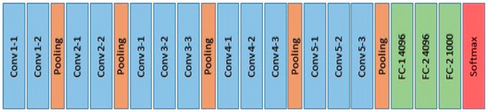The architecture of the VGG-16 model (illustrated in Figure 4) comprises five blocks of convolutional layers with max-pooling for feature extraction. The convolutional blocks are followed by three fully-connected layers and a final 1 × 1000 Softmax layer (classifier). The input to the ConvNet is a 3-channel (RGB) image with a fixed size of 224 × 224. The first block consists of two convolutional layers with 32 filters, each of size 3 × 3. The second, third, and forth convolution blocks use filters of sizes 64 × 64 × 3, 128 × 128 × 3, and 256 × 256 × 3, respectively.