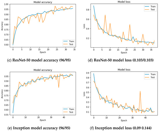 Comparative models accuracy and loss diagram. In (a) the VGG-16 model final accuracy is 97.83% for training and 98.86% for the validation. In (b) the final loss is 0.0572 for training and 0.042 on the validation set. In (c) the ReseNet-50 model final accuracy is 96.23% for training and 95.61% for the validation. In (d) the final loss is 0.103 for training and 0.102 on the validation set. In (e) the Inception model final accuracy is 96.77% for training and 95.42% for the validation. In (f) the final loss is 0.109 for training and 0.144 on the validation set.