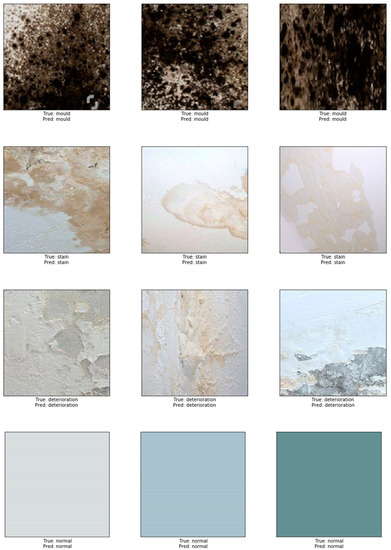 To test the robustness of our model, we performed a prediction test on 732 non-used images dedicated for evaluating our model. The accuracy after completing the test was high and reached 87.50%. A sample example of correct classification of different types of defects is shown in Figure 6. In this figure, representative images show the accurate classification of our model to the four classes: in the first row, mould prediction (n = 167 out of 183), in the second row stain prediction, (n = 145 out of 183), in the third row deterioration prediction (n = 157 out of 183) and in the fourth row the prediction of normal class (n = 183 out of 183). An example of misclassified defects is shown in Figure 7. The representative images in this figure show failure of the model to correctly predict the correct class. Thirty eight images containing stains were misclassified; 31 as paint deterioration and six as mould and one as normal. Twenty six images containing paint deterioration were misclassified; 13 as mould and 13 as stain. Sixteen images containing mould were misclassified; four as paint deterioration and 12 as stain. The results in this figure illustrates an example where our model failed to identify the correct class of the damage caused by the damp. The false predictions for images by modern neural networks have been studied by many researcher [68,69,70,71,72]. According to Nguyen et al. [68], although modern deep neural network achieved state-of-the-art performance and are able to classify objects in images with near-human-level accuracy, a slight change in an image, invisible to human eye can easily fool the neural network and cause it to mislabel the image. Guo et al. argue that this is primarily due to the fact that neural networks are overconfident in their predictions and often outputs highly confident predictions even with meaningless inputs [70]. In this work Guo et al. studied the relationship between the accuracy of neural network and the predictions scores (confidence).