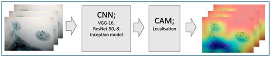 CAM is a computational-low-cost technique used with classification-trained ConvNets for identifying discriminative regions in an image. In other words, CAM highlights the regions in an image which are relevant to a specific class by re-using classifier layers in the ConvNet for obtaining good localisation results. It was first proposed by Zhou et al. [65] to enable classification-trained ConvNets to learn to perform object localisation without using any bounding box annotations. Instead, the technique allows the visualisation of the predicted class scores on an input image by highlighting the discriminative object parts which were detected by the neural network. In order to use CAM, the network architecture must be slightly modified by adding a global average pooling (GAP) after the final convolution layer. This new GAP is then used as a new feature map for the fully-connected layer which generates the required (classification) output. The weights of the output layer is then projected back on to the convolutional feature maps allowing a network to identify the importance of the image regions. Although simple, the CAM technique uses this connectivity structure to interpret the prediction decision made by the network. The CAM technique was applied to our model and was able to accurately, localise defects in images as depicted in Section 4 and Section 5.