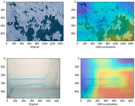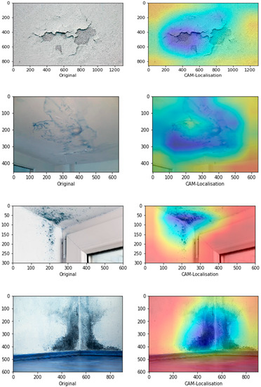 Figure 9 represents the schematic illustration of CNN-CAM localisation. Following the high accuracy in detecting the three classes we then, asked the question: can our model detect the actual localisation of these classes? To do so, we integrated the CAM [41] with our network. The CAM is a technique that uses the gradient of an object under consideration entering the final convolutional layer of the ConvNet to produces a coarse localisation map which highlights the most significant regions in the image for predicting the class of this image. It can be seen from the images in Figure 10 with representative images showing different defects accurately localised using CAM method: in first row sample of images containing paint deterioration, in second row a sample of images containing stains, and in third and fourth rows samples of images containing mould that, our model has accurately allocated the defect in each image with high precision. In few cases, however, incorrect localisation was obtained, for example the images in Figure 11 showing some defect incorrectly located by our model. Although the first image contains paint deterioration spread over large areas of the image and the second image contains a large stain, both defects were miss-localised by our model.