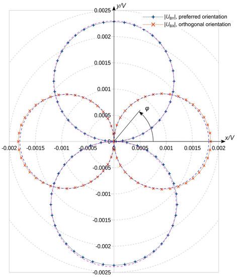 Simulated polar plots of the magnitude of two bridge unbalance signals versus flow azimuth angle for the design of Figure 1a. The tilt azimuth was manually incremented from 0° to 360° in uniform steps of 5°, the bridge supply voltage amounts to 1 V, the heating power to 2.5 mW and the NTC to 0.02 K−1. Dashed circles indicate the ideal characteristics.