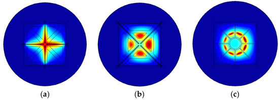 Membrane view (x–y-plane) of excess temperature of three design alternatives. All devices comprise eight thermistors (two orthogonal arrangements, each comprising four thermistors) and heaters. As a heat source serve either heaters (i.e., calorimetric operating mode as depicted in (a)) or a self-heating effect of the thermistors (b,c).