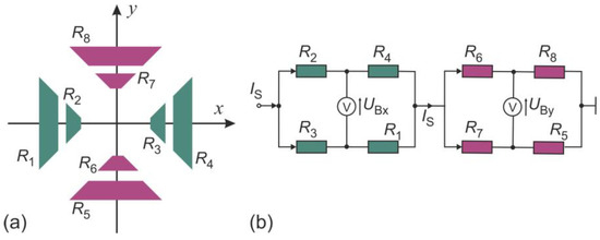Good flow sensitivity requires sufficient upstream/downstream distance between heating resistors and the involves bridge thermistors while closer spacing extends the measuring range. For best conversion of the x component of the flow, the well separated thermistors 2, 3, 6, and 7 in Figure 7 are mainly responsible in conjunction with the heating resistors aligned along the direction, i.e., the “wide” configuration. The action of the other two heating resistors enhances the flow conversion and improves the approximation to the desired sinusoidal variation of the bridge detuning signals as a function of the flow direction. The design example discussed herein offers in conjunction with the appropriate Wheatstone bridge configuration a nearly perfect azimuthal precision of flow velocity transduction over a wide flow magnitude range.