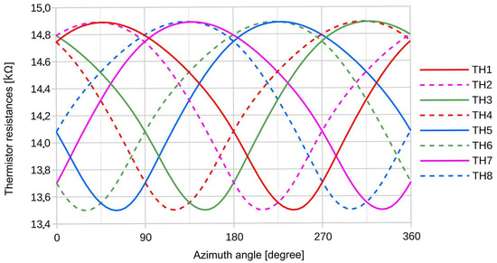 Figure 8 depicts simulation results for the eight thermistor resistances as a function of the flow direction. As we deal with NTC thermistors, resistance maxima correspond to temperature minima and vice versa. Because of the small relative changes, the thermistor temperature curves look like vertically mirrored resistance curves. The shape of these curves is typical for the impact of the convective heat transfer. Around the upstream position (maximum resistance) of a specific thermistor, there is a broad azimuth region where convective cooling dominates resulting in elevated resistance values. In contrast, lowering of resistances takes place only within a smaller azimuthal region around the downstream position. Downstream thermistors are less cooled or even heated by convection since the fluid temperature is somewhat elevated within a narrow lobe in the wake of the power dissipating elements in the membrane. Thus, the different curvature around the maxima and minima of these resistance characteristics is a common feature of all 2D calorimetric flow transducers.
