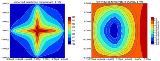 (Left): Contour plot of the membrane temperature field for a flow rate of 1 m/s from left to right. (Right): Corresponding contour plot of the convection induced temperature change in Kelvin at the surface of transducer membrane. A total heating power of 3 mW is applied.