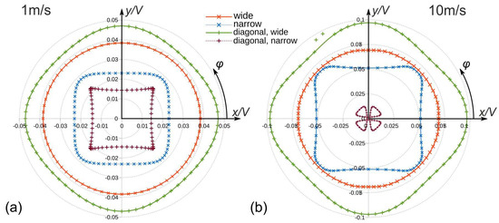 Figure 10 depicts directional diagrams of the flow transduction signals generated from simulated bridge detuning signals of four distinct combinations of two perpendicular Wheatstone bridges. They reveal the strong dependency of the output signals on the involved combination of thermistor locations on the membrane. The azimuth angles of the diagrams refer to the flow velocity azimuth φ where φ = 0 coincides with the x-axis of Figure 7. To highlight the influence of the velocity magnitude, directional diagrams for 1 m/s as well as 10 m/s are illustrated in Figure 10.