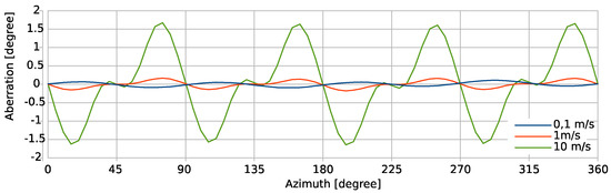 The markers on the curves in Figure 10 indicate uniform increments of the rotation angle of the flow direction by five degree each. The stronger the flexion of the directional characteristic, the tighter the marker positions. Therefore, the direction of the 2D vectors composed of the detuning signals of orthogonal thermistors bridges do not coincide perfectly with the respective flow direction. Figure 12 highlights the azimuthal deviation between the actual flow direction and the azimuth angle computed from simulated transducer signals for the preferable “wide” bridge configuration. The diagram reveals that the aberration changes its sign between 0.1 m/s and 1 m/s. Beyond 1 m/s the aberration grows drastically when the flow velocity is increased.
