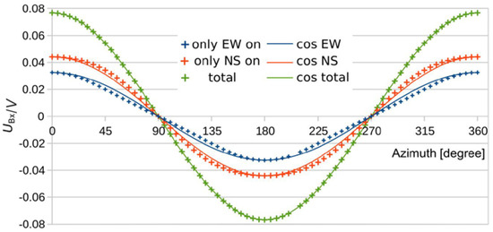 Figure 13 shows simulated bridge detuning voltage UBx for three heater configurations, i.e., (i) all four heating resistors operated (total), (ii) the two heaters extended in x direction are heated exclusively (only_EW_on), and (iii) only the heaters extended in y direction are operated (only_NS_on). Each characteristic is displayed together with respective fits with cosine functions. The flow magnitude conversion induced by a single pair of heating resistors exhibits marked deviations from the wanted sinusoidal azimuth dependence, as Figure 13 illustrates. However, the different partial heater operations cause opposite signal deviations from ideal cosine characteristics. As these contributions are superimposed to the total signal, a nearly perfect compensation of conversion errors takes place. Thus, the excellent uniformity of the flow magnitude conversion envisioned in Figure 11 turned out to be a beneficial coincidence. Hence the action of all four heating resistors is required to achieve bridge detuning signals that deliver a nearly perfect magnitude uniformity over the full azimuthal range.
