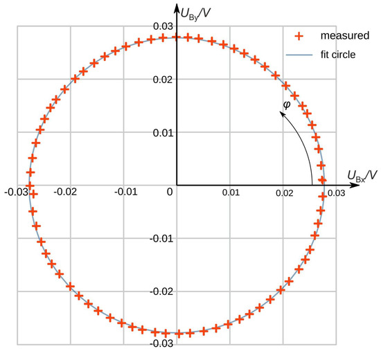 The sensor chip was mounted flush with the bottom of a rectangular flow channel of 12 mm width and 1 mm height. The channel axes can be rotated 360° around the normal to the center of the membrane surface. Filtered nitrogen was used for the gas flow. The velocity of the nitrogen in the channel was adjusted by a mass flow controller with a range up to 2000 cm3/min, which corresponds to a maximum velocity of 27 m/s. The flow guidance setup has been described in detail in [20,21]. Figure 14 depicts a diagram of UBy vs. UBx measured with a transducer featuring the design of Figure 7, where the zero-flow bridge offsets have already been subtracted. The intended position of the transducer surface is flush with the bottom wall of a rectangular flow channel.