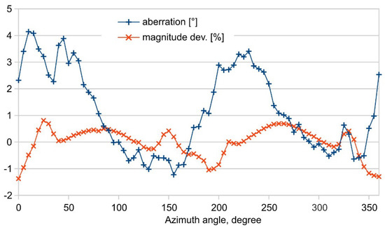 Measured relative magnitude variation (in percentage) and aberration (in degrees) related to the directional characteristic of Figure 14.