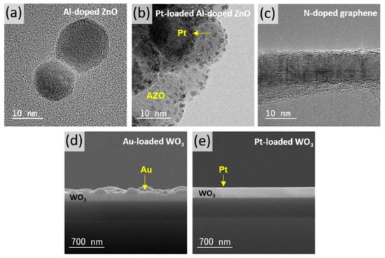 TEM images of (a) Al-doped ZnO (AZO) nanoparticles (NPs), (b) Pt-AZO NPs, and (c) N-doped graphene and SEM images of (d) the Au-loaded WO3 (Au-WO3) thin film and (e) the Pt-loaded WO3 (Pt-WO3) thin film.