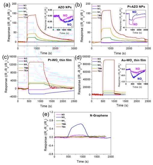 Variation in the sensing responses to 10 ppm of the five N-containing compound gases for the (a) AZO NPs, (b) Pt-AZO NPs, (c) Pt-WO3 thin film, (d) Au-WO3 thin film, and (e) N-doped graphene at 400 °C.