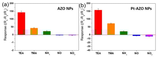 Bar graph of the sensing responses of the (a) AZO and (b) Pt-AZO NPs to 10 ppm of the N-containing compound gases at 400 °C.