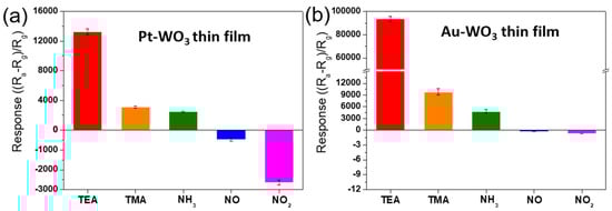 Bar graph of the sensing responses of the (a) Pt- and (b) Au-WO3 thin films to 10 ppm of the N-containing compound gases at 400 °C.