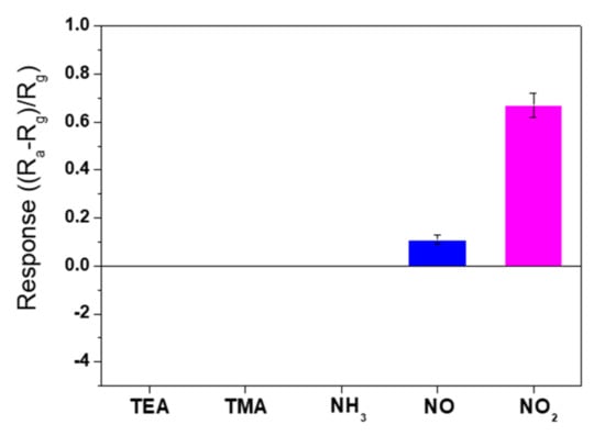 Various sensing materials have been investigated for the detection of N-containing compound gases. For the detection of tertiary amines (TMA, TEA), metal oxides, such as TiO2, WO3, MoO3, LaFeO3, SnO2, and ZnO, have been tested [,,,,,,,,,,,,]. Sensing materials based on WO3, MoSe2, multi-walled C nanotubes, and graphene oxide have been reported to exhibit good sensitivity to NH3 gas [,,,,,,,,]. Nitric oxide (NO, NO2) sensing has recently been performed using metal oxides, such as ZnO, SnO2, and WO3, and metal–polymer composites, such as nickel phthalocyanine (NiPc) and graphene [,,,,,,,,,,,]. However, the highly sensitive and selective detection of N-containing compounds is urgently required.