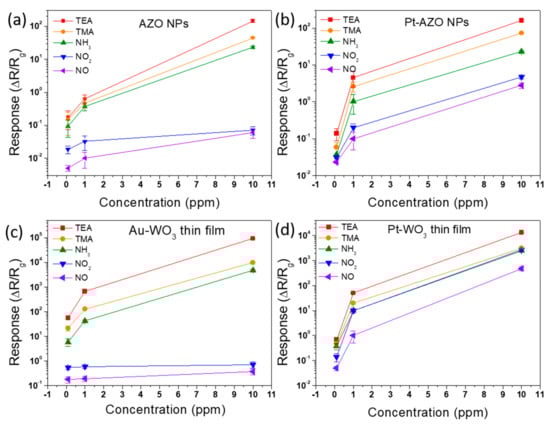 Sensing response of (a) AZO NPs, (b) Pt-AZO NPs, (c) Au-WO3 thin film, and (d) Pt-WO3 thin film to different concentrations of the five N-containing gases at 400 °C.