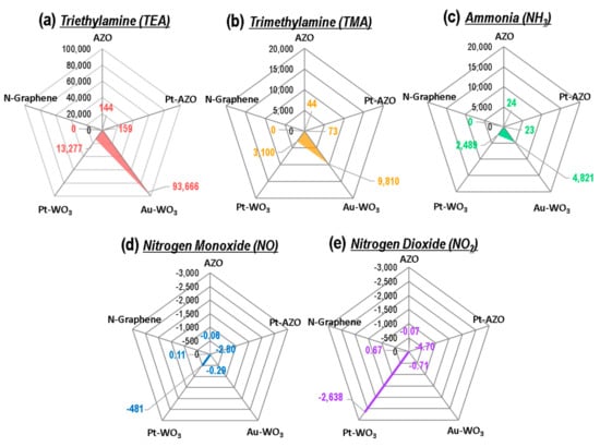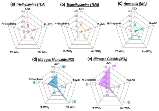 Radar plots of the sensing responses ((Ra − Rg)/Rg) of the five sensing materials to 10 ppm of (a) TEA, (b) TMA, (c) NH3, (d) NO, and (e) NO2.