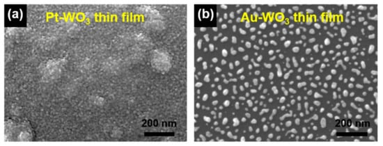 For synthesizing Pt-WO3 and Au-WO3 thin films, WO3 thin films were prepared via dual ion beam sputtering []. A tungsten metal target of 99.99% purity was employed. The WO3 was deposited onto an interdigitated Pt electrode formed on a Si/SiO2 wafer via a photolithography process. The dual ion beam consisted of a primary ion beam applied to the target and a secondary ion beam with accelerated atoms to be deposited on the substrate. The tungsten target was sputtered under the following conditions: The power of the main ion gun was 90 W, the voltage of the anode was 50 V, and the voltage of the cathode was −50 V. O ions were applied under the following conditions: The power of the assistant ion gun was 120 W, the voltage of the anode was 1000 V, and the voltage of the cathode was 300 V. The thickness of the WO3 thin film was 200 nm. Pt (2 nm) and Au (2 nm) were deposited on the WO3 thin film via direct current (DC) magnetron sputtering as catalysts. The thickness of Au and Pt was adjusted to ~2 nm by controlling the deposition time, where the deposition rate was 0.67 nm/s for Au and 0.28 nm/s for Pt. The samples were heat-treated at 550 °C for 1 h.