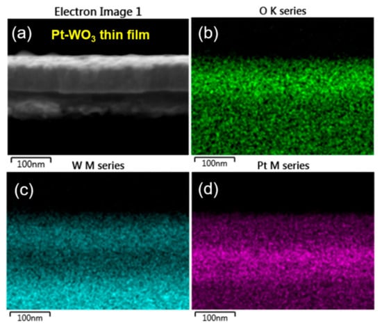 (a) Cross-sectional SEM image depicting analyzed region of Pt-WO3 thin film and energy-dispersive X-ray spectroscope (EDS) elemental color mapping images for (b) O, (c) W, and (d) Pt elements.