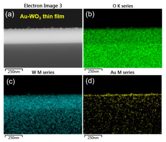 (a) Cross-sectional SEM image depicting analyzed region of Au-WO3 thin film and EDS elemental color mapping images for (b) O, (c) W, and (d) Au elements.